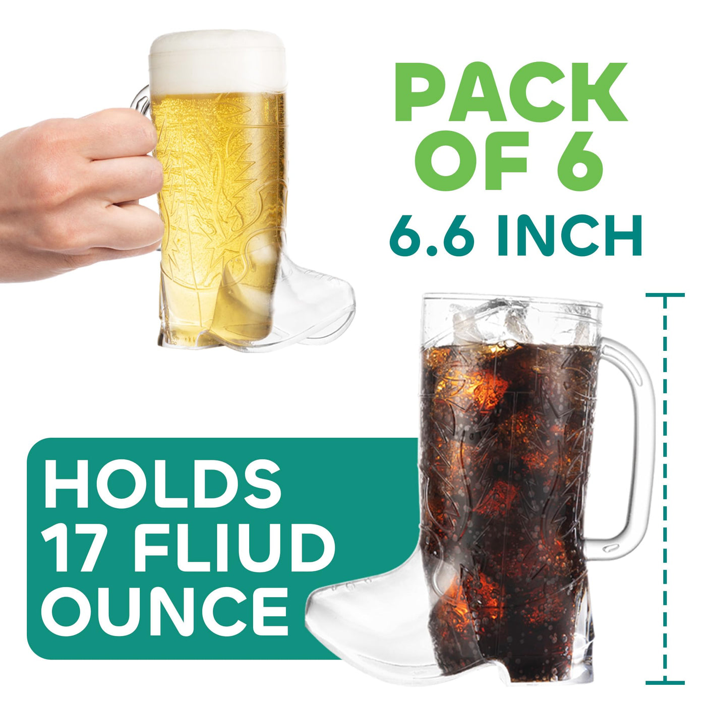 A must-have for serving your guests at your next western-themed party. Wrangle up all your friends for your next event and use these cowboy mugs for drinks, centerpieces, party favors, and more. Each order of (6) Cowboy Boot Cups and sturdy handles. Cowboy Mugs are made of durable hard plastic BPA-Free and hold up to 17 ounces of liquid.