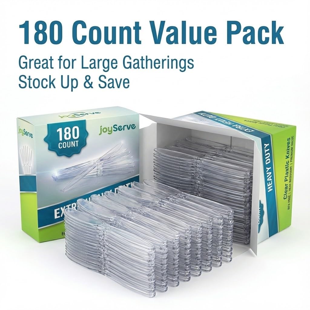 Sturdy, sharp, and crystal clear, this 180 pack of clear knives disposable is the reliable choice for any event or everyday use. These knives plastic disposable are designed to look elegant on your table while giving you the strength you need to slice through steak, chicken and more. Each plastic knife heavy duty is made from premium BPA-free material, so your heavy duty plastic knives clear won’t bend, snap, or melt under pressure. Perfect for stocking your paper & plastic household supplies, this set gives you heavy duty plastic silverware, plastic silverware heavy duty, and plastic cutlery heavy duty you can count on. Use these plastic ware utensils and plastic utensils heavy duty as take out knife options for food trucks, meal prep, and catering, or as disposable silverware heavy duty, silverware plastic disposable, and bulk silverware disposable for home dinners and parties. This heavy duty plastic cutlery and silverware plastic works for indoor dinners, backyard BBQs, office events, and more. Great as plastic knives bulk, it’s also ideal if you’re searching for plastic knoves or reusable plastic utensils for larger gatherings where washing is optional. These utensils plastic disposable pair beautifully with any party theme. The clear plastic silverware design coordinates effortlessly with clear plastic silverware, clear knives disposable, and plates, cups, and napkins in gold, silver, white, black, clear, yellow, red, and more. Set an inviting table for Christmas, new years, thanksgiving, Hanukkah, Easter, graduations, anniversaries, baby showers, and other fancy celebrations without worrying about cleanup. Whether you’re hosting a small family meal or a big catered event, this heavy duty plastic cutlery 180 pack keeps you ready. Enjoy the convenience of plastic knives bulk and bulk silverware disposable with the upscale look of clear plastic silverware every time you serve.