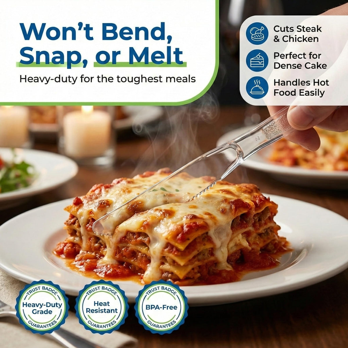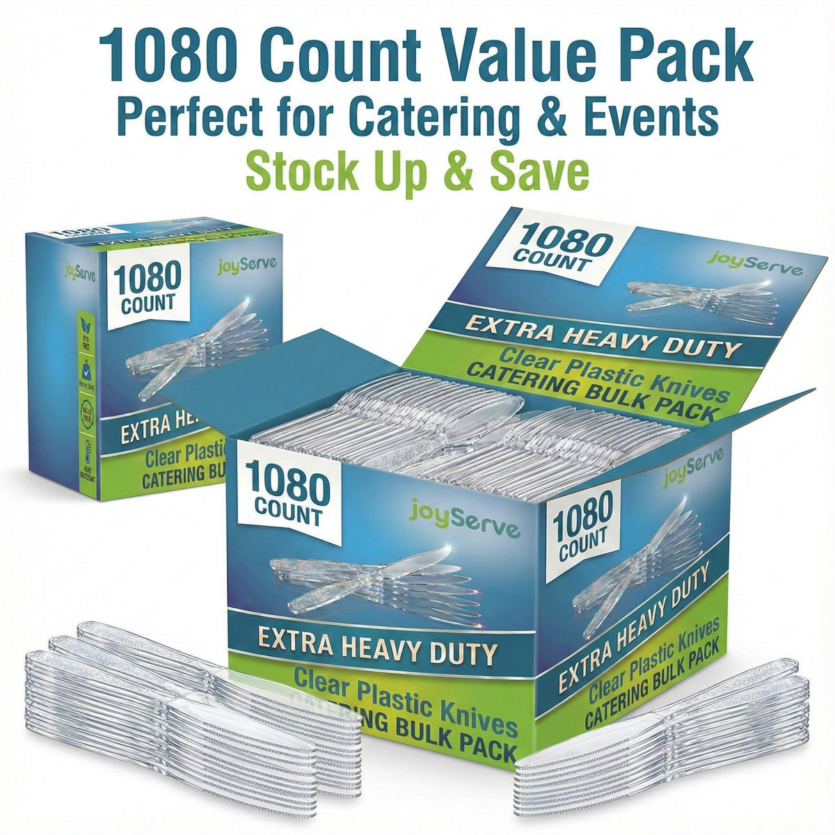 Sturdy, sharp, and crystal clear, this 1080 pack of clear knives disposable is the reliable choice for any event or everyday use. These knives plastic disposable are designed to look elegant on your table while giving you the strength you need to slice through steak, chicken and more. Each plastic knife heavy duty is made from premium BPA-free material, so your heavy duty plastic knives clear won’t bend, snap, or melt under pressure. Perfect for stocking your paper & plastic household supplies, this set gives you heavy duty plastic silverware, plastic silverware heavy duty, and plastic cutlery heavy duty you can count on. Use these plastic ware utensils and plastic utensils heavy duty as take out knife options for food trucks, meal prep, and catering, or as disposable silverware heavy duty, silverware plastic disposable, and bulk silverware disposable for home dinners and parties. This heavy duty plastic cutlery and silverware plastic works for indoor dinners, backyard BBQs, office events, and more. Great as plastic knives bulk, it’s also ideal if you’re searching for plastic knoves or reusable plastic utensils for larger gatherings where washing is optional. These utensils plastic disposable pair beautifully with any party theme. The clear plastic silverware design coordinates effortlessly with clear plastic silverware, clear knives disposable, and plates, cups, and napkins in gold, silver, white, black, clear, yellow, red, and more. Set an inviting table for Christmas, new years, thanksgiving, Hanukkah, Easter, graduations, anniversaries, baby showers, and other fancy celebrations without worrying about cleanup. Whether you’re hosting a small family meal or a big catered event, this heavy duty plastic cutlery 180 pack keeps you ready. Enjoy the convenience of plastic knives bulk and bulk silverware disposable with the upscale look of clear plastic silverware every time you serve.